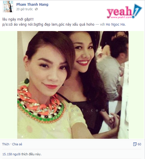 Trong một show thời trang, đôi bạn thân Hà Hồ và siêu mẫu Thanh Hằng lại có dịp sát cánh bên nhau. "Lâu ngày mới gặp!!! p/s:cô áo vàng nói:bgthg đẹp lam,góc này xấu quá hoho"- Kiều thị chia sẻ trên trang cá nhân. Bức ảnh tự sướng này đã nhận được nhiều sự ủng hộ từ fan của Hà- Hằng.